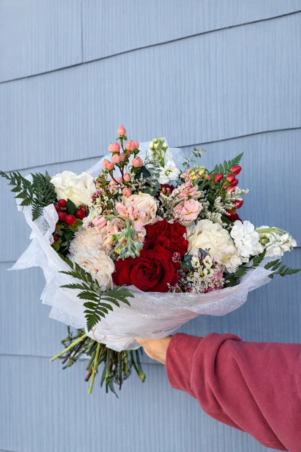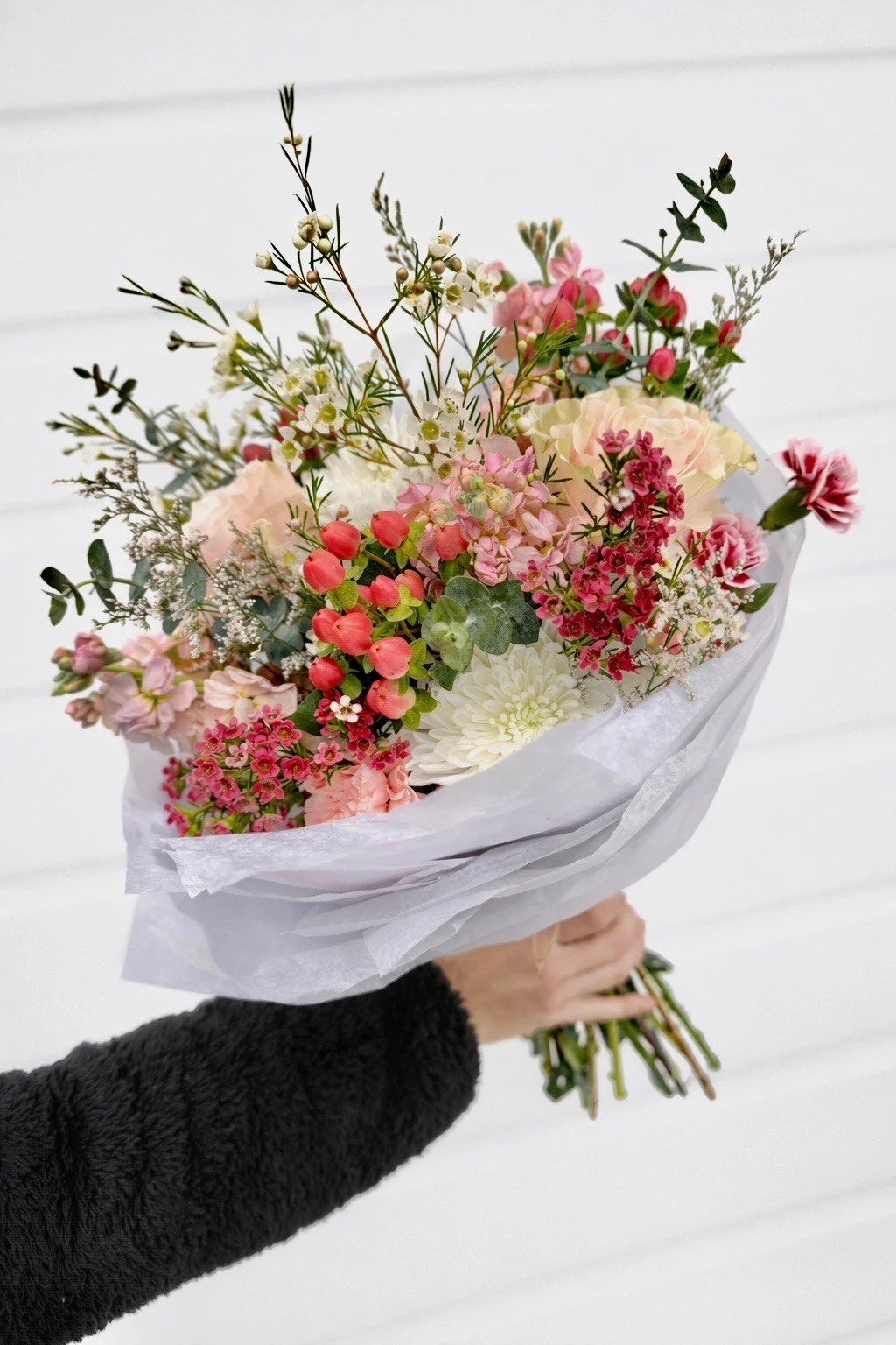 The Pretty in Pink Bouquet is one of our signature Valentine’s designs, thoughtfully crafted to express affection, admiration, and heartfelt care. Each bouquet showcases the season’s signature roses, artfully paired with a curated mix of seasonal blooms in a soft, dreamy palette of pinks and whites, accented with lush greenery.